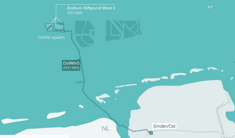 Die Gleichstromverbindung DolWin 5 mit einer Leistung von 900 MW verbindet den Offshore Windpark Riffgrund 3 nordwestlich von Borkum über ein 100 km langes Seekabel in Richtung Süden bis zum Anlandungspunkt Hamswehrum in Ostfriesland. Von dort führt ein 30 Kilometer langes Landkabel zu der nun im Bau befindlichen Konverterstation in Emden/Ost.